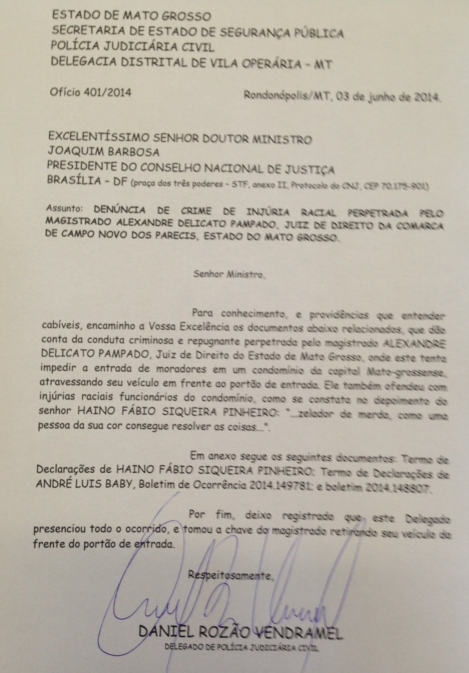 O delegado da Polícia Civil, Daniel Rozão Vendramel, enviou um ofício ao Conselho Nacional de Justiça denunciando o juiz Alexandre Delicato Pampado, do município de Campo Novo dos Parecis, por injúria racial. De acordo com o delegado, o magistrado teria ofendido um funcionário do condomínio Bonavita, ao ao chamá-lo de “zelador de merda” e perguntar: “como uma pessoa da sua cor consegue resolver as coisas?”, destaca o documento.