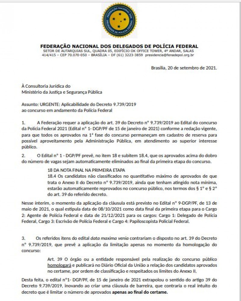 A Federação Nacional de Delegados da PF (Fenadepol) enviou carta à Consultoria Jurídica do Ministério da Justiça solicitando alterações no edital, a fim de que seja mantido o cadastro de reserva além do dobro das vagas oferecidas, a fim de futuras convocações e, desta forma, evitar novos gastos com mais concursos para as vagas.