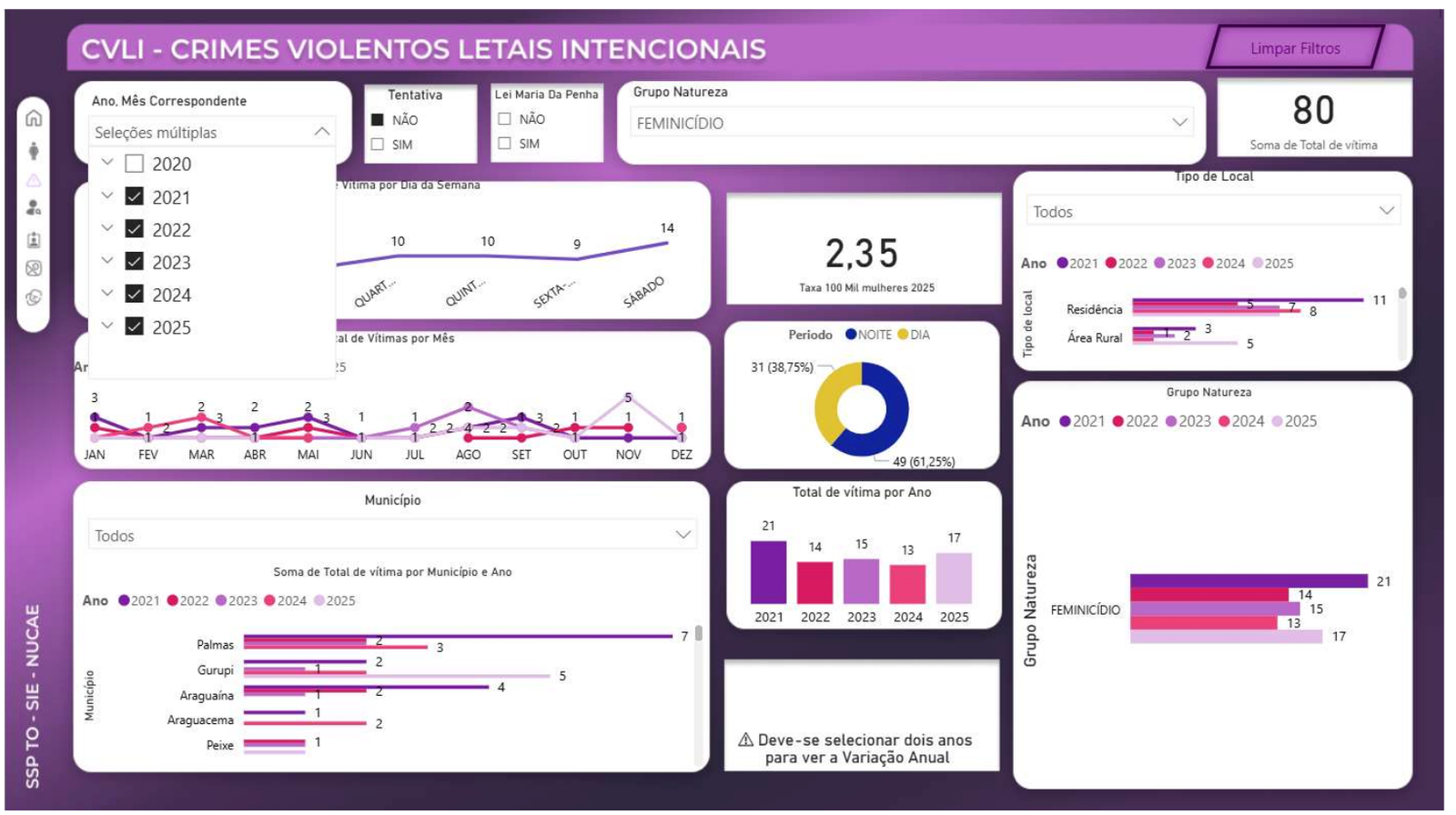 Entre 2021 e 2025, o feminicídio no Tocantins desenha uma curva que oscila entre reconhecimento e preocupação. São cinco anos em que os gráficos mostram barras e linhas, mas quem sente o impacto são mulheres, filhos, pais, mães e comunidades inteiras. De acordo com o painel de Crimes Violentos Letais Intencionais (CVLI) da Secretaria da Segurança Pública, apenas nesse período o Estado registra 80 mulheres assassinadas por serem mulheres: 21 em 2021, 14 em 2022, 15 em 2023, 13 em 2024 e, com o ano ainda em curso, 17 em 2025.