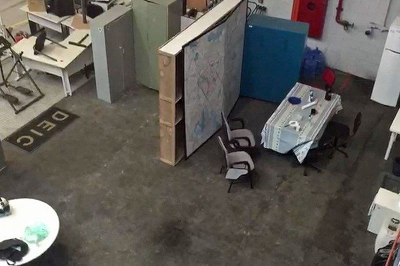 Uma academia foi improvisada no meio do hangar. O saco de pancadas foi pendurado no teto e o equipamento de musculação divide espaço com mesas velhas. Quando chove, a calha não dá conta da quantidade de água. Na segunda-feira (26), a chuva forte deixou a sala dos investigadores alagada.