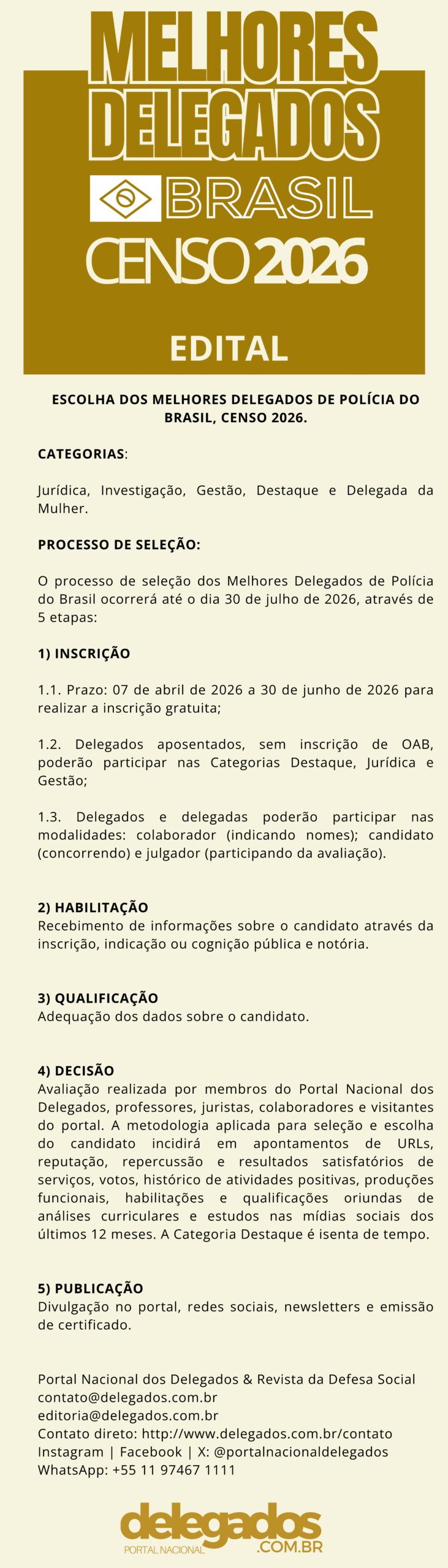 O Portal Nacional dos Delegados convida todos a participarem, de forma direta ou indireta, da escolha como Colaborador, Candidato ou Julgador. Como Colaborador, poderá indicar nomes de pessoas que possuam qualificações para concorrer. Como Candidato, o delegado ou a delegada concorrerá nas Categorias: Jurídica, Gestão, Investigação, Destaque e Delegada da Mulher. como Julgador, analisará os candidatos de forma complementar. Sua participação é muito importante. Contribua com a valorização e o reconhecimento dos delegados de polícia do Brasil.