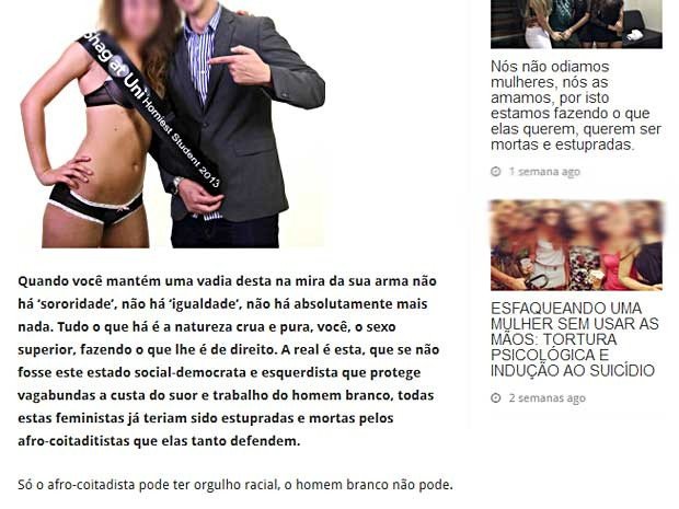 O site tem link que direcionam a outros artigos que incitam a violência. Em uma das páginas, a “dica” é sobre tortura psicológica, indução ao suicídio ou como “esfaquear uma mulher sem usar as mãos”. Outra publicação incita os leitores a a estuprarem lésbicas. “Salve uma mulher do homossexualismo e da Aids.”