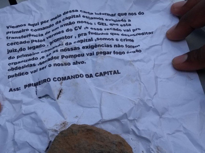 De acordo com o comandante da Área Integrada de Segurança (AIS) 20, tenente-coronel José Ednardo Calixto, a carta foi recebida na manhã da segunda-feira. “Dois indivíduos, se passando por membros do PCC e utilizando uma motocicleta, passaram em frente ao Fórum, atiraram para cima e jogaram uma carta digitada, se dizendo da facção e exigindo a transferência de um companheiro que estava preso na Cadeia Pública de Senador Pompeu”, contou.